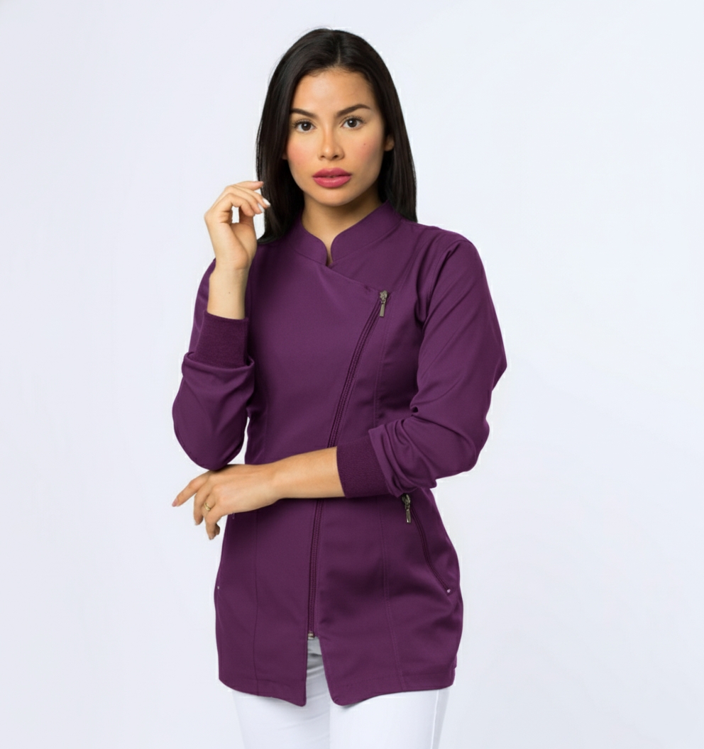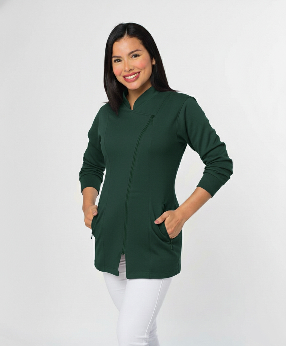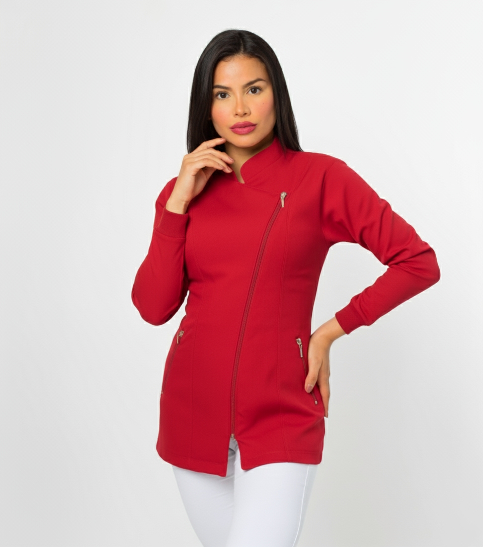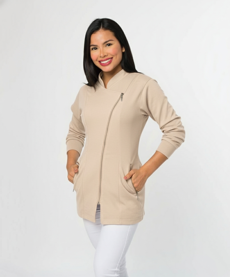 Mini chaqueta dama cierre cruzado. Bolsillos laterales con cierre. Manga larga con puño. Tela importada antifluido strech